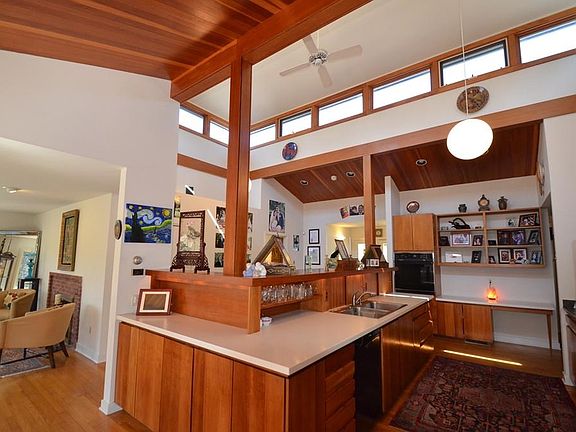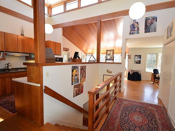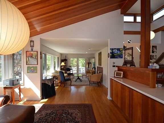 Custom Contemporary with gracious living on two levels. Wonderful natural light comes from the clerestory windows. Open floor plan with cherry kitchen in center of home with Living & Dining on one side and the family room on the other. Living room has fireplace and opens onto a generous deck. Master suite & second bedroom with 1/2 bath & laundry room complete the 1st floor. Lower level offers a media room w/fireplace, two additional bedrooms, full bath & small kitchen. This home offers many gathering spaces as well as get away spaces on two levels OR one could live on one floor and have another generation on the other. Gleaming hardwood floors on both levels, gas heat, Central A/C, 2 fireplaces, 2-car Garage, large screened porch, cedar closet, storage space & more. Oversized 1.97 Acre lot with frontage on 2 streets. Nice garden area, over-sized parking & shed. This unique home needs to be seen to be appreciated.