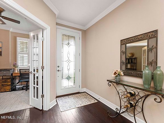 Your Dream Home Awaits in a Serene Lakefront Setting! Step into this immaculate ''Taft Street'' floor plan, ideally situated on a rare lake-to-preserve lot that offers stunning, peaceful views. This beautifully maintained home features two bedrooms, two baths, and a private office with elegant French doors-perfect for work or relaxation. The heart of the home is the lovely kitchen, equipped with upgraded shaker cabinetry, a large island with seating, sleek stainless steel appliances, granite countertops, a stylish backsplash, and pantry-ideal for entertaining or everyday living. The owner's suite is a true sanctuary, complete with dual sinks, an expansive walk-in shower, and an impressive walk-in closet. Elegant hardwood floors, plantation shutters, and an extended garage with epoxy floors elevate the home's style and functionality. The screened pavered patio offers a perfect spot to unwind while enjoying the peaceful views, with panoramic vistas across the entire fenced back yard. Additional features include overhead storage rack in garage, attic stairs, garage sink, and paver driveway. Just a short stroll to the Anastasia Clubhouse, where a world of resort-style amenities awaits you. Dive into the sparkling pools, challenge friends to a game of pickleball, relax in the spa and sauna, or stay active in the fully-equipped fitness center. With golf cart-friendly streets and a vibrant community offering endless clubs and activities, Del Webb Ponte Vedra is the perfect blend of luxury and convenience. Plus, enjoy all the perks of living in the sought-after Nocatee area, with its incredible amenities just moments away. This is more than just a home; it's a lifestyle. Don't miss out-this opportunity won't last long!