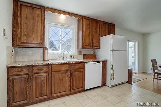 Full brick well-cared for ranch style house with partial basement, finished, with a one-car garage on a large corner lot and fenced backyard. Beautiful hardware floors throughout the main level, spacious living room and large dining room. Kitchen has granite countertops, tile floors and all kitchen appliances are staying including the refrigerator. Additional updating includes neutral interior colors, 6-panel doors, updated double pane windows and a newer roof. In addition, the clothes washer, dryer, upright freezer, and fire resistent metal file cabinet are included. From the dining room is the private fenced backyard with large covered patio - utility shed will stay. NO HOA! Close to elementary school and only several blocks to the west is open space. Seller will provide at closing a Buyer 1-year AHS Shield Plus Home Warranty ($650.)
