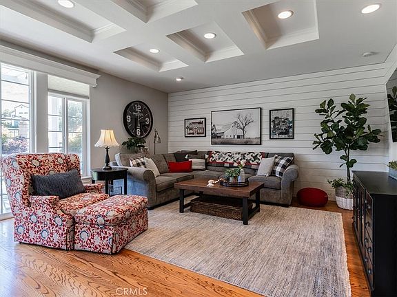 The family room has shiplap paneled walls with handsome tray ceiling and recessed lighting. The dry bar is located ideally for ease of use and is equipped with excellent storage as well as an under-counter beverage refrigerator. Glass doors will draw you to the beautifully manicured yard with views of the golf course and hills.