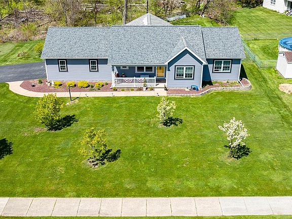 Newer 2013 construction. LIGHT AND BRIGHT! Beautiful Ranch, Backs to Woods! Open Floor Plan, 3 BD, 2 Full Baths, 1st Floor Laundry, Cherry 36" Cabinets, Dovetail Drawers, Under Cabinet Lighting, Quartz Counters, Breakfast Bar, Pantry Cabinet, Front Dinette, All Appls Included S/R/W/D, Luxury Vinyl Flooring and Into Great Rm/Dining Area, 14' Ceilings, Gas FPLC, Recessed Lighting, French Door to 12 x 16 Grey Vinyl Deck & White Vinyl Railings, Overlooks 130 x 214 Fenced Yard, with a nature-lover's view of the backyard wooded lot and sit on the deck and enjoy the sounds. Tile Floor, Cherry Vanity, Quartz Counter, Tub/Shower, Big Main BD, Walk-In Closet, Linen Closet, Main BED with Full Bath, Tile Floor, 48" Cherry Vanity, Quartz Counter, Walk-In Shower, Polished Travertine Tile Walls, Corner Seat, Brushed Nickle/Glass Shower Doors, Very Nice! Full Tall 12 Course Bsmt, Central Air, 200 Amp Electric, 2 x 6 Exterior Walls, Thermopane Windows, Architectural Roof, Big 2.5 Car Garage (24 x 24) Door to Fenced Backyard, Front Covered Porch, Colored Sidewalk Entry, Wide Driveway, Parking Space and Turnaround Space....