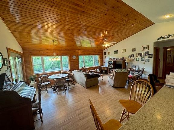 Well maintained 2 bderoom single story home with radiant floor heat, and 2 car attached garage. Entering the house from the covered front porch you enter a cathedral v-groove ceiling dining/living room opening to a beautiful kitchen with eating counter. A short hallway leads to master bedroom with large closet and exterior door to concrete deck in back yard. Next comes the second bedroom with closet and built in desk. There is a huge full bath with washer and dryer adjacent to the bedrooms. There is a furnace room off the garage. The home sits on 4.3 acres, open around the home, with the remainder of softwoods. A real easy keeper. Closing upon seller finding adequate housing.