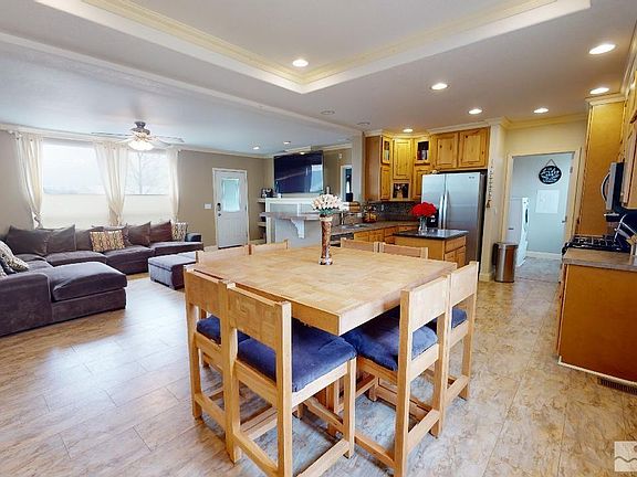 3 beds, 2 baths, home on over a half-acre across from the Junior High and near the park, in town with a 1200 and a 284 sqft detached garages. The bigger garage is fully insulated and finished with recessed lighting, 240 power and electric car charging station. Large patio area in the back, fenced yard, grass, playset stays, storage shed and sprinkler system. In the front you have beautiful curb appeal, with a stamped concrete walk, faux log siding as well as grass and full sprinklers. Inside you have an, open concept,split bedroom floor plan, Simply Safe alarm system with water detection that will stay, keyless entry on all the doors including the garage and the home is prewired for surround sound. Large living room with gas log fireplace as the focal point. The dining area has tray ceilings. The kitchen has all brand-new appliances, ample counter and cabinet space, breakfast bar and tile back splash. The master is large with a walk-in closet, double sinks and a new tile and stone walk in shower to die for.