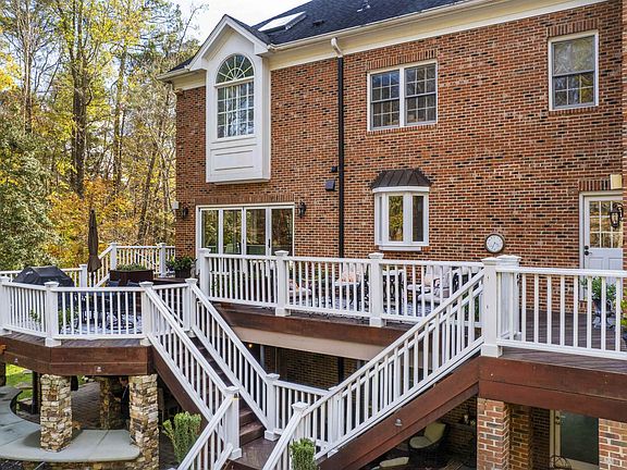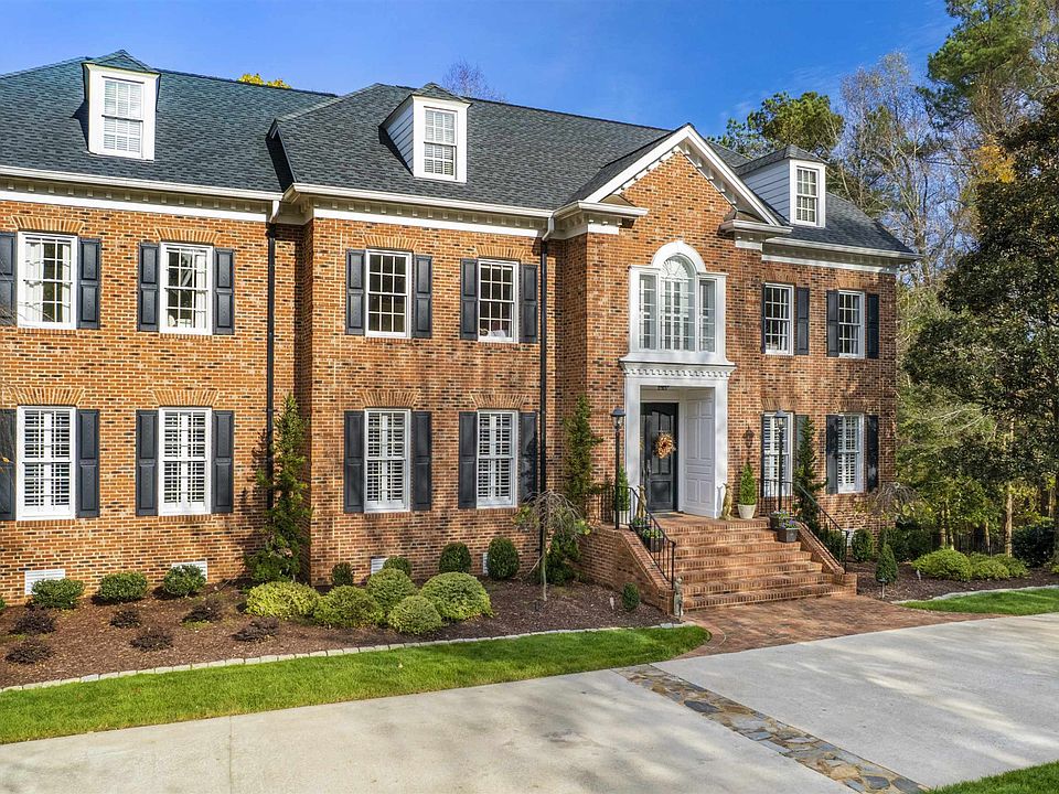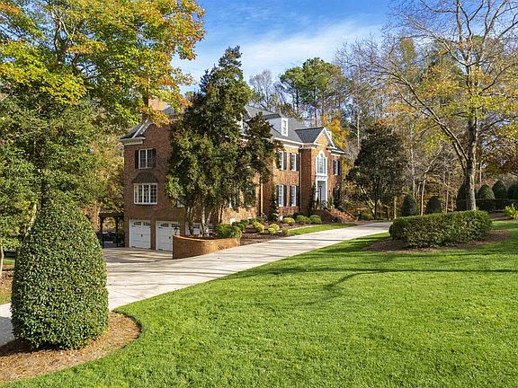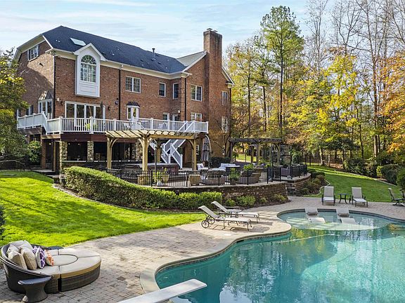 Stylish/ Private/Presence best describe this home in Sheffield Manor. Wonderful outdoor entertaining space with detached stone fireplace, beautiful pool, 3-car garage, remodeled kitchen and bathrooms, 9-foot ceilings, open floor plan, circular drive, 900+ bottle wine cellar, brick ex. Front and rear staircase, Daylight bsmnt leading to the pool and perfect for workouts. Ea. bdrm connected to a bath. Double cul-de-sac. Convenient to banking, retail and shopping @ Muirfield Village on Falls of Neuse. lst flr bedrm currently used as an office.
