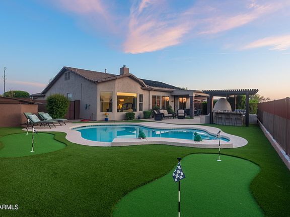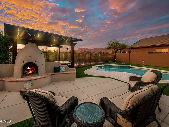 WOW! ***You'll love this Home with FANTASTIC SUPERSTITION MOUNTAIN VIEW from Fabulous RESORT STYLE BACKYARD*** with Solar HEATED POOL, Built-in BBQ BAR, Pergola, HOT TUB, 2 Putting Greens, OUTDOOR FIREPLACE, Large Covered Patio, EXPANDED SUNNY PATIO & Storage Building too! ***This Awesome (Former Model) Home boasts a Fantastic OPEN FLOOR PLAN (one of the BEST in the area) with BIG OPEN KITCHEN with HUGE ISLAND, Great Room with FIREPLACE, Separate GUEST CASITA, Den, NEW HVAC, RV GATE & Much More! You'll also appreciate the New Landscape Watering System (2025), New Water Heater (2021), New Refrigerator (2020) and more! ***This POPULAR GATED NEIGHBORHOOD offers... LOW HOA FEES of only $67 per month, including Garbage! ***MUST SEE, Don't wait too long!