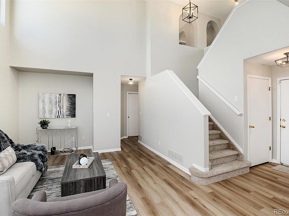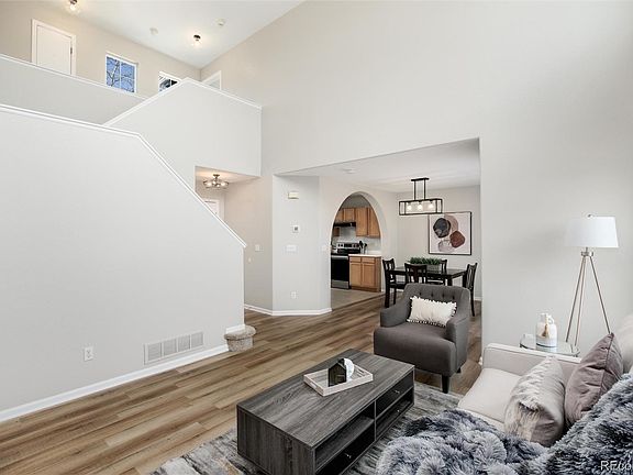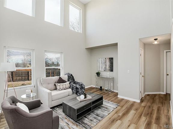 This truly lovely, move-in, ready home will not disappoint! Enter through a covered front porch and into a light and bright living room with vaulted ceiling, two stories of windows, brand new luxury vinyl plank flooring, and modern light fixtures. The main room has an open concept to the kitchen and dining. This good size kitchen has lots of cabinets, a pantry, and some stainless steel appliances. The dining area flows nicely from the kitchen and through sliding glass doors onto the back patio for the best of Colorado’s indoor/outdoor living and dining. This lovely backyard provides ample space for entertaining, playing, and gardening. Enjoy the concrete patio and fire pit area in your private backyard. Also, on the main level of the home, you will find a convenient bedroom and a full bathroom. Laundry is also on this level for true "main floor living." Upstairs is the primary bedroom with vaulted ceiling, fan, walk-in closet, and an en suite bathroom with soaking tub and double sinks. Down the hall are three additional good sized bedrooms and a large hall bathroom. The basement is fully finished with what could serve as another bedroom, media, or hang out space along with an additional three-quarter bathroom. The entire interior of the home was just re-painted and new carpeting throughout. Walk to the Thornton Community Park and swimming pool. Enjoy quick access to King Soopers, Sam's Club, shopping and dining. Five minutes to I-25. This great home in a convenient location is ready to be yours!