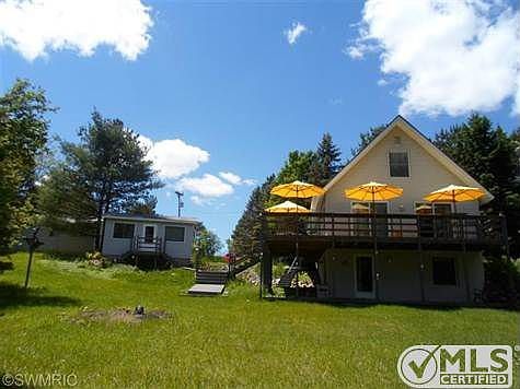 Immaculate chalet on almost six acres of land and approx. 600 feet of frontage on the Muskegon River. Detached guest house, 2 car garage, newer windows and roof, the setting is very private yet so close to town. This is a one of kind property in top notch condition!