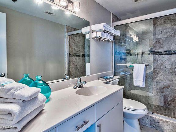 Beautiful Gulf Front 1 Bedroom 2 Bath + Bunk Room condo at the Shores of Panama. For rent monthly from January 1, 2020 thru March 1, 2021. You will find this unit to be tasteful decorated with tile flooring, granite and cabinets throughout. You will find amazing gulf and pool views in which you can see from the master bedroom, living room and kitchen through the extra large, floor-to-ceiling windows/patio door.Shores of Panama, is a 23 story Tuscany style condominium of gulf front luxury accommodations offering unparalleled amenities including almost 500' of Gulf frontage, 13,966 sq. ft. million dollar Gulfside, zero entry lagoon-style gulf side pool, Gulf side hot tub, Large heated indoor pool & hot tub, covered on-site parking deck, health center with fitness, two tiki bars serving