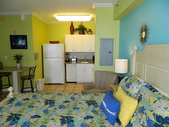 SPECIAL FINANCING AVAILABLE! Affordable Condo For Sale at Shores of Panama! Super cute studio plan, newer furnishings, nice decor, recently painted. New AC and Water Heater. Private balcony full of sunshine and breezes. Water filled views of incredible tropical pool area and sandy beaches of the Gulf of Mexico. Tiki Bar, beach service, hot tub. Beautiful pool amenities, beach and grounds. Gym and spa. Game room. Covered portico entrance. Convenient location to dining, shopping and entertainment. A short trolley ride to Pier Park! It's time to find your place in the sun!