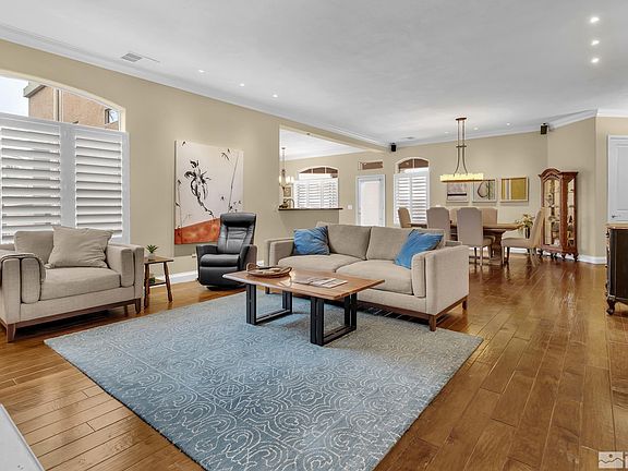 Dream Home at Fleur de Lis! This stunning single-level gem with 2 car garage boasts a fabulous open floor plan that is clean, crisp and perfect for modern living. The spacious living area is warm, inviting and provides an ideal space for entertaining or relaxing. The custom features are endless: Hardwood Flooring, Upgraded Stainless Appliances & Refrigerator, Granite Countertops, Large Pantry, Center Island, Designer Subway Backsplash, Built-in Bar with Wine refrigerator and Custom Plantation Shutters., The wrap-around patio with new pavers is a highlight, offering a serene outdoor space to enjoy the breathtaking views of the 3 nearby ponds. The patio is perfect for outdoor dining, gardening or simply soaking up the sun. Inside, the home boasts a big laundry room with an attached office, providing a convenient space to work from home or tackle everyday tasks. The large closets throughout provide ample storage space, while keeping belongings organized and accessible. All interior walls are freshly painted. The HVAC duct work has been professionally cleaned, and an air purifying system has been installed. With 3 bedrooms, there's plenty of room for family, guests or even a home gym or hobby room. The stunning grounds of this gated community are beautifully landscaped and impeccably maintained with water features, resort-style swimming pools, walking trails and BBQ areas. Enjoy the elegant club house and social gatherings. Hang out in the wine room, billiard and card room, library or movie theater. There is a full fitness center and spa. Enjoy resort style living in a wonderful South Reno location and the best floor plan in Fleur de Lis.