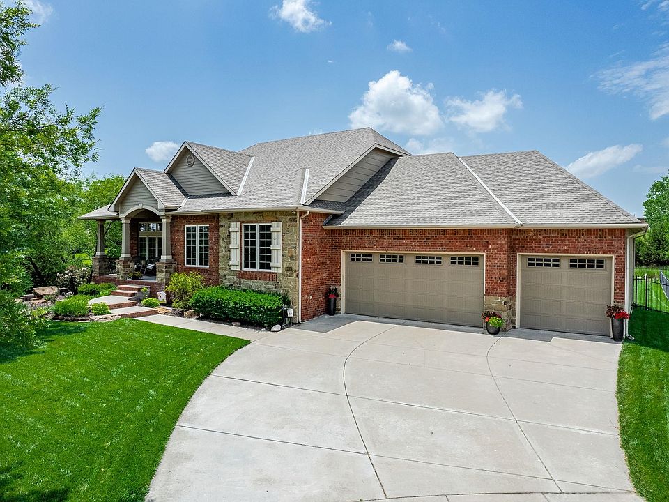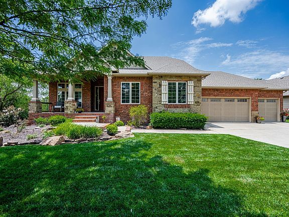 *Back on the market through no fault of the sellers* Welcome home to this one owner, custom built home in Maize schools with 5 bedrooms, 3 baths, 3 car PLUS tandem garage on a .44 acre cul de sac lot in the highly-sought after community of Fox Ridge. Professional landscaping, fenced yard, mature trees, covered front porch and the appeal of the brick and stone create a lasting first impression. Entering the home the sense of elegance and craftsmanship will be dramatic with vaulted ceilings, built ins, newer paint, hardwood floors, open plan and two living areas on the main level. The kitchen is the heart of the of the home and this one is superior. Granite counters, spacious walk in pantry, soft close mechanisms, eating space at the island and stainless appliances. Kitchen is open to dining and living and living has two sided gas fireplace to the living areas. Large windows offer lots of natural light throughout and all window treatments remain. Dining room offers space for large dining and wonderful views of the backyard. Primary bedroom through double doors has a coffered ceiling and primary bath has a soaker tub, granite counters with double sinks, tile floors and separate tile shower. Primary closet is grand with lots of storage and closet is adjacent to the laundry room. Laundry has wash sink and folding counters. Drop zone off the garage has been thoughtfully designed and also incudes a desk area. Remainder of the main level are two bedrooms and a full bath with a granite counter and tile floors. Basement is an expansive space and offers multiple areas for relaxation and entertainment and has view out windows and walk out. Granite wet bar has tile floors and space for a full size refrigerator along with additional storage. Basement has newer carpet and paint along with built ins and a gas fireplace. Bonus in this home is the office AND an additional finished room that is currently being used as an exercise room but could be a play room, another office, theater room-lots of options. Basement also has two additional bedrooms, full bath with granite counter and tile floors and a storage room. Covered composite deck, shed, patio and a sport court (and still room for other yard play beyond the sport court), wrought iron fence, irrigation well and sprinklers and the delightful trees and landscaping that surround you all make your outdoor experience enjoyable and offers a private feel. Three car plus garage with single car door off the back makes for easy access for mowing and the work space for projects or vehicles in the garages is a hobbyist delight. Neighborhood amenities include two pools (one is lifeguarded), baby pool, playground and winding walking paths. Location is convenient to Eisenhower airport, highways, hospitals, and shopping at New Market Square and there is a walking path to Maize South schools. Schedule your showing today!