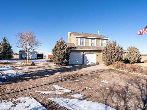 Close in rural property located east of Cheyenne. Plenty of room for all your toys, this home has several living areas great for entertaining and large gatherings. Six bedrooms, three bathrooms, and two car attached garage. On the lower level is a delightful family room with full rock-wall fireplace and wet bar plus an additional bedroom that could be used as a den/study. Outbuilding is 40x30 with an attached lean-to and horse pens. Covered RV parking and 250+/- trees. Seller reserves all mineral rights.