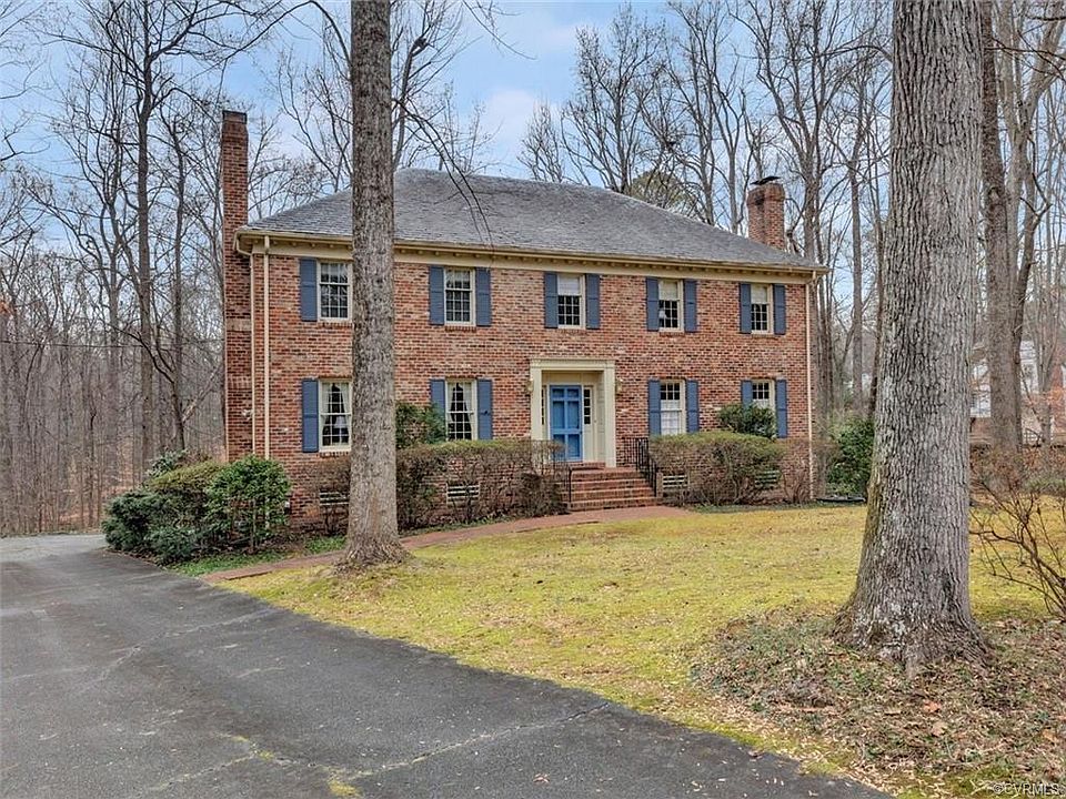 Beautiful architecture adorns this colonial, built by John Stinson, Sr. on 1.68 private acres south of River Rd. & adjoining Drouin Hill - "The best-kept secret in Henrico Co." (RTD). This stately home w/ large elegant rooms for entertaining family & friends. The 1st floor hosts a living & family room both w/ gas fireplaces, hardwood floors, & moldings, a spacious updated kitchen complete w/ wood cabinets, granite counter tops, & breakfast nook overlooking backyard. Upstairs, the spacious master has an en-suite bath that was completely renovated in 2018 w/ ceramic tile shower/floor, NEW sink/décor & double closets. Down the hall, 3 generous bedrooms share the hall bath. In the basement, you're presented w/ a huge area for entertaining - game room or rec. room w/fireplace & walk out basement to a large patio. Direct garage access allows easy entry & exit from your vehicle. For those DIYs, the garage has plenty of space for a workshop & additional storage. You simply cannot beat this quality home w/ peaceful views of mature woods & wildlife, all while being minutes from schools, restaurants, & shopping. Must see property in an excellent location of Henrico Co.!