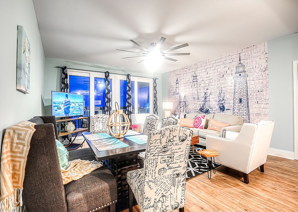 *** Owner is a Licensed Real Estate Agent In State Of Florida This Uniquely Designed 2 Bedroom Condo will take your breath away! Beautifully decorated with the latest design trends, it creates the ultimate comfort for your Panama City Beach Getaway! The living room is well appointed with comfortable and stylish furniture, including a sleeper sofa, smart TV with Netflix account and upgraded channels like HBO and latest apps.The kitchen is fully equipped with all necessary items to cook a meal, from high end toaster, coffee maker to the latest washer and dryers. The master bedroom is very spacious with a balcony and en suite bathroom, a very comfortable King bed and a TV. The second master also has a flat screen TV with a Netflix account and al the latest apps and upgraded channels, like HBO. The nook area offers the bunk bed, lots of storage and a fun environment for the kiddos to play in and have their own space away from adults. The unit has an extremely large balcony that overlooks the lake and the Vegas style fountain show every night. The condo is located on the 6th floor, so once you park your vehicle on the 6th floor parking level, you walk straight to your unit without needing any elevator. The putting green and kids pools are just 2 floors down.