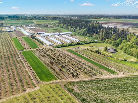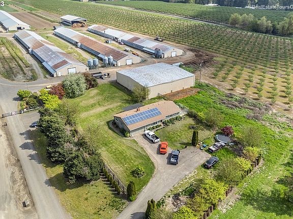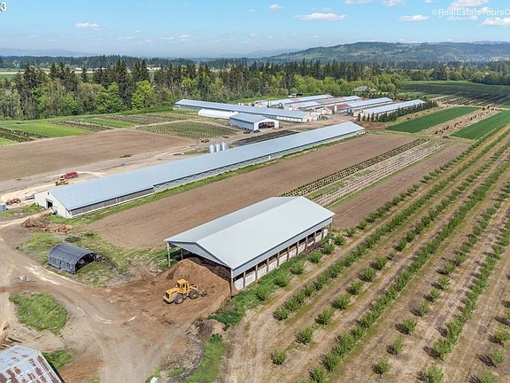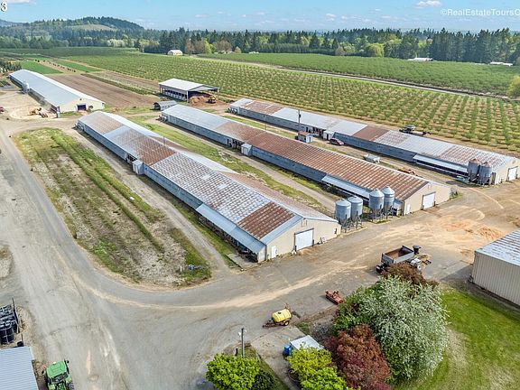 Income producing chicken farm with 9 chicken barns and current CAFO permit. Approx 212,000 sf of outbuildings, concrete flooring, all individually electrically metered, alarmed and temperature controlled. New manure shed, storage sheds, workshop and office on site. Approx 36 acres of usable ground with class A soils and water rights. 25 acres currently planted in Jefferson hazelnuts. 2 homes on property. Gorgeous custom built home in the back is 3361 sf, 3 bed/2.5 bath. Front home is approx 2,000 sf. Both have great yards!