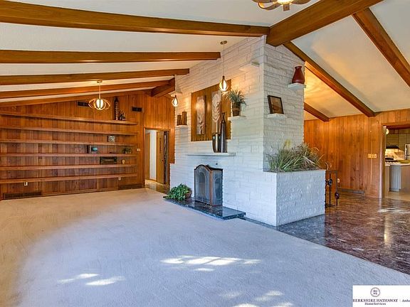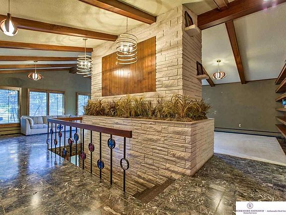 Mid-century modern one of a kind Ponca Hills home with almost an acre of land, 3 bedrooms on main floor each with private full baths that have custom tile floor to ceiling. Inviting kitchen with pantry and dining area that is open to formal dining room with beautiful marble floors. Formal living room with grand stone fireplace that stretches from the vaulted ceilings to basement. House has a zero entry front door and an elevator to lower level walk out where you will find a family room with fireplace, wet bar and a second kitchen. The floors throughout house are terrazzo, marble and tile and are set on concrete joists between the main and lower level. Exterior of house is a combination of stone and tile that helps make this a unique one of a kind home.
