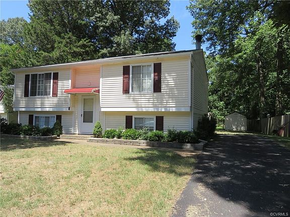 Spacious split-level home on a large Chesterfield County lot! This one is ready for its next fortunate owner! The upper level offers a spacious living room with open flow to the dining room. Kitchen appliances are included! Two bedrooms and a full bath are both on this level as well. Downstairs, a cozy family room with a corner brick fireplace awaits you as does the master bedroom with walk-in closet! Another full bath is down here as is the large utility/ laundry room. Washer and dryer stay! There's a large walk-in closet under the stairs too. You'll admire the exterior too! Replacement window, two-level rear deck, two sheds and a deep back yard. Plenty of room for a garden spot and outdoor activities! Paved driveway, concrete sidewalk, and vinyl siding. Low traffic cul de sac street! Convenient to 288 and Iron Bridge Rd, easy access to downtown Richmond and surrounding counties will be enjoyed from this address. Shopping, dining and more can be found close by. One year warranty too!