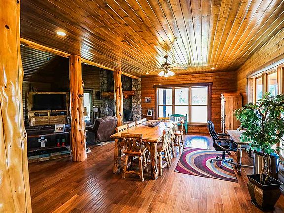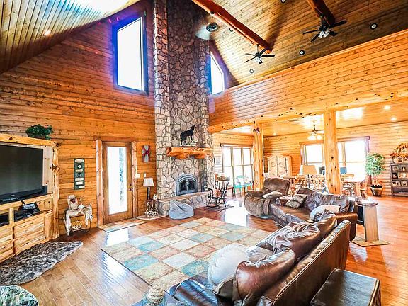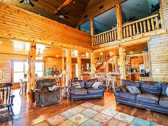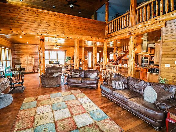 CUSTOM BUILT 2 STORY LOG SHOWPLACE ON ALMOST 80 AVRES OVERLOOKING STOCKED LAKE. 5 BEDROOMS 3 1/2 BATHS. HUGE OPEN ISLAND KITCHEN OVERLOOKING SOARING ROCK FIREPLACE. GRANITE COUNTERS , CUSTOM NATURAL CEDAR PEELED LOGS AND STAIRWAY LEADING TO MASSIVE LOFT AREA WITH 2 BEDROOMS AND BATH ALSO UPSTAIRS. CRYSTAL CLEAR LAKE JUST OUTSIDE THE WRAP AROUND PORCH STOCKED WITH CATFISH AND BASS. 5500 SQ FT UNDER ROOF WITH OVER 4000 SQ FT INSIDE. SOME WOODED AREAS WITH TROPHY SIZE DEER AND HAY MEADOWS FOR HORSES OR COWS. LARGE METAL SHOP BUILDING. LOCATED AT THE END OF COUNTY ROAD AND VERY SECLUDED AND PRIVATE.