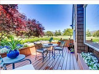 As you enter through the front door of this well located 2 bedroom 2 bath end unit you'll realize the quality and care that has been put into this home. There are fabulous views out to the pond and 18th fairway from the living room, dining room, family room and an expansive gardener's deck complete w/ fountain. A remodeled Pullman kitchen includes updated counters, newer cabinets, gas cooktop, double oven & stainless steel sink. The cozy family room has built-in book shelves & TV enclave. Just off the kitchen is an updated bathroom with, marble countertop & shower. The second bedroom is currently converted to a nicely appointed office with built-in desk, drawers, shelves and dry bar. Upstairs is the master suite with en-suite bathroom and a spacious custom built walk-in closet. Oak floors throughout both levels, a gas fireplace and built-in dining room cabinets make this condo a comfortable place to call home. Within an easy walk of all Carmel Valley Ranch amenities.