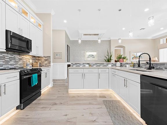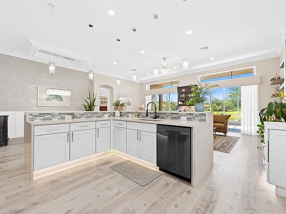 Beautifully Remodeled 3-Bedroom, 2-Bath Home With A 2-Car Garage In A Vibrant 55+ Guard Gated Community Offering Amenities Like Pickleball, Tennis, Billiards, Café, Clubhouse, Gym And More. The Kitchen Features Quartz Countertops, Custom Glass Tile Backsplash, New Stainless Steel Appliances, Dove-Gray Shaker Cabinets, Under-Cabinet Lighting, And A Breakfast Nook. Custom Bar With A Wine Cooler, Built-In Fireplace, And A Spacious Primary Suite With Walk-In Closets, Tray Ceiling, Dual Sinks, Soaking Tub, And Walk-In Shower. Designer Lighting, Crown Molding, Waterproof Laminate Flooring, And Barn Doors Add Style. Relax On The Screened Patio With Lake Views. Accordion Shutters Provide Storm Protection. HOA Covers Lawn Maintenance, Exterior Painting, Cable/Internet And Alarm Monitoring.