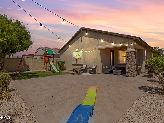 Welcome to this beautiful 3-bed, 2-bath home in the desirable Eastmark! Its charm starts with a 2-car garage, paver driveway, stone accent details, & a manicured landscape. The interior exudes sophistication with tall ceilings, tons of natural light, neutral paint, wood-look tile flooring in common areas, and plush carpet in bedrooms. Discover the seamlessly flowing open layout! The gourmet kitchen boasts SS appliances w/gas cooktop, granite counters, staggered cabinetry w/crown molding, a pantry, recessed & pendant lights, and an island w/breakfast bar. The den is just off the front entry. The main bedroom has an ensuite with dual sinks, separate tub/shower, & a walk-in closet. You'll love the large backyard with a covered patio, well-laid pavers, lush lawn, & trees for refreshing shade! PLUS! Eastmark is a vibrant master-planned community featuring a resort-style pool, 4,000 sq ft splash pad, fitness & community center, and over 100 acres of parks, trails, & sports courts. Residents enjoy frequent events, clubs, and access to top-rated schools. A public library, expanding retail, & dining options add to its appeal. Don't miss this opportunity!