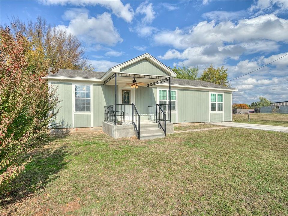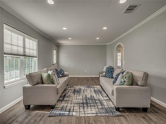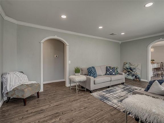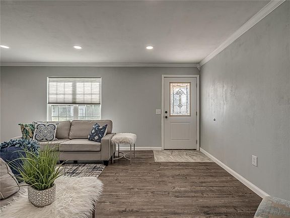 A dainty beautiful remodle with a kiss of vintage flare. Don't be fooled by the size. Nestled in Carl Albert Schools, this three bedroom home sits on a quarter acre with mature trees and a cozy covered front porch. Open living room, bathed in natural light, flows into the dining area and kitchen with unique island contains additional bar seating. Crown molding in living areas and wood look flooring through out. Enjoy a good soak in the claw foot tub or set up a patio set on the concrete pad outback to refresh in the sweet Oklahoma breeze. This house was taken down to the studs, just about everything is new. Minutes from I-40 access and all your favorite Midwest City amenities gives you the perfect excuse to swing by and check it out yourself.