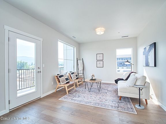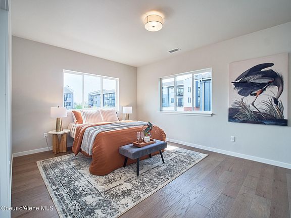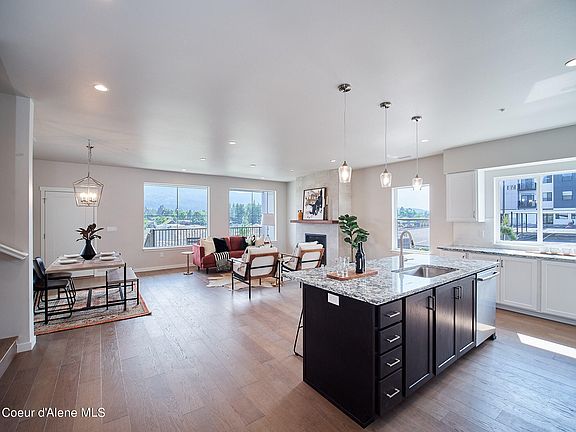 Mountain Views south from this beautiful townhome tucked away off of the busy through streets in mixed-use neighborhood minutes to the shops, restaurants, half a dozen parks several of which are waterfront on the Spokane River providing access to Lake Coeur d'Alene, marinas, gyms, grocers and more! This condo is loaded with finishes like hardwood floors, tiled primary bathroom floors and shower with mudset pan, quartz counters throughout, expansive windows, gas fireplace with tile surround + reclaimed wood beam mantle and more. The heated oversized garage with epoxy floors is detached to create a private fenced courtyard perfect for the bbq + yard games or the puppy with low maintenance concrete, turf, and landscaping rock. There is a 655sf family room over the garage (FROG) w/ LVP floors, heated and cooled... the perfect place for a home office, game room or MIL suite, complete with plumbing ready to go in the walls so you can finish the layout to your taste over time.