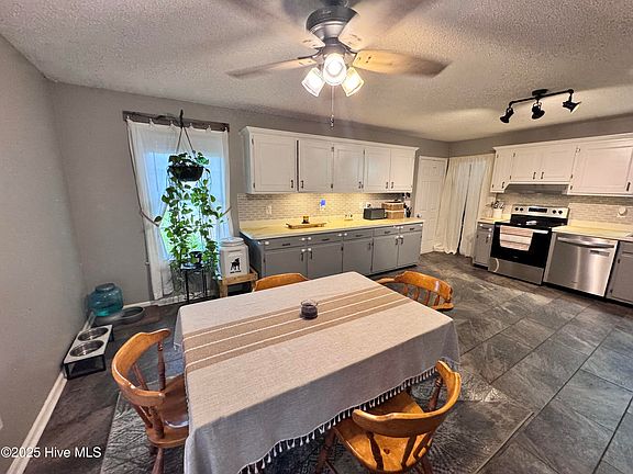 Brick ranch with Red tin roof in quiet neighborhood with a quaint farmhouse feel. Located half way between Beaufort and Havelock just a Short drive to Cherry Point. Large open kitchen with plenty of space for family dinners or entertaining. Upgraded appliances and new Hot Water Heater. Custom built ins around fireplace in living room. 4K Flat screens in living and master bedroom convey. Custom window treatments throughout house. Windows professionally tinted for privacy and temperature control. Master with two closets and custom tiled surround in walk in shower. Back yard features a workshop with lots of storage options. Would be perfect for chickens as well. Large fully fenced in yard with peach, fig and pecan trees. Schedule to see this one today!