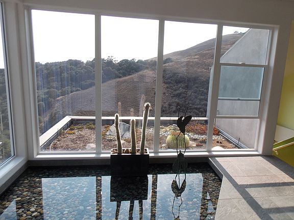 This tranquil retreat nestled in the hills offers complete privacy with panoramic views of the ocean & surrounding hills from all levels of the home. This gorgeous contemporary home welcomes you at the front door with a reflecting pool framed with an ocean view. Off the foyer you will find an office with its own bathroom and spectacular views. Down stairs, the main living level is a great open space with a dining area and large living room perfect for entertaining. Open the commercial-grade sliding glass doors & take in the setting sun from the expansive deck. The homes bamboo floors have radiant heating, Alder cabinets throughout, glass cornered windows throughout, with Absolute Black granite counter-tops and GE Monogram appliances in the kitchen. The living room boasts a Vermont Castings wood burning fireplace to cozy up to. The amazing Master bedroom has a spa like feel with an over-sized walk-in closet, his/her sinks and unforgettable views from every angle.