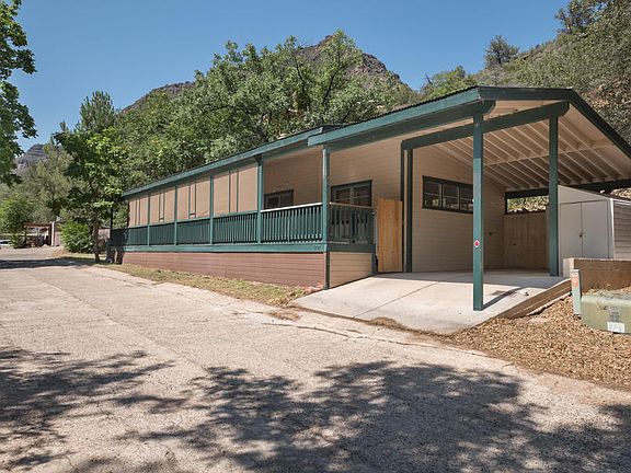 Located just north of Sedona in cool, shady Oak Creek Canyon, this home sits high above Oak Creek but allows access to multiple swimming holes in the area. Perfect getaway spot for anyone looking to avoid the crowds in town and hide out in the shade near the creek. Front deck offers outdoor relaxation and al fresco dining potential. This older unit has been recently upgraded with new flooring and is ready for a full time owner or investment. Enjoy the star-filled nights from this scenic Sedona getaway.