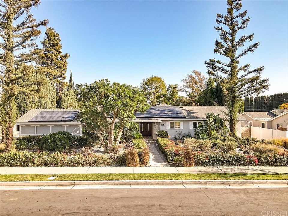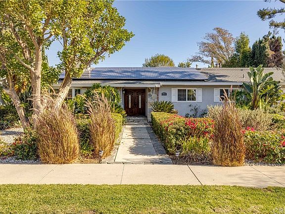 This wonderful solar powered home with a pool is within walking distance to the award-winning Nobel Middle School. The fabulous curb appeal meets all the requirements of drought tolerant / natural landscaping with diverse planting, reduced lawn size, and perfect balance. Three large Sequoia trees and a wall of cypress provide complete privacy for you and your guests. Double doors open to a very clean and spacious floor plan, complete with two fireplaces, wood vinyl floors, dual pane windows and a home office. There is a formal living room, and a dining area that can expand to seat 20 guests. The remodeled kitchen features granite counters, stainless steel appliances and a garden window. All guest bedrooms and bathrooms are spacious and perfectly located. The master bedroom and bath offer dual sinks, a large tub and separate shower. One bedroom with private bath is currently a home office. There is untapped potential to expand the use of the rear grounds by adding a structure or additional parking, perfect for RV and multiple vehicles. Additional features include: 2020 A/C compressor, pool pump, attic insulation and interior painting. 2017 new plumbing. Pool has been resurfaced and main sewer line to street replaced.