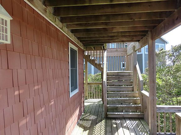 NEW ROOF & HVAC compressor May 2024! Capture the laid-back South Nags Head experience that has been so popular with owners and vacationers forever! OCEAN VIEW and just what you need for a relaxing oceanside stay. Excellent beach access around the corner with convenient stairs over the dune. Lots of decking to take in the ocean breezes. Peeks of distance sound view from kitchen window and top-level bedroom slider & balcony, especially nearing sunset! Many NEW/NEWER elements like two 2-3 year old remote-controlled mini-split systems in upper level den and bedroom--they really cool! Going back to Spring 2014 numerous upgrades and replacements were begun--all New Anderson windows and sliders (“Hurricane” type on upper level); New upper deck and railings; New siding; and beginning of interior remodeling spanning several years including New interior drywall textured with “knock down” finish and all fresh interior paint. Beautiful gunstock oak flooring in foyer, hallway, stairs and entire top level except tile in bath, which has new toilet, stall shower and vanity. Water heater 2010. Low-maintenance Berber carpet in three mid-level bedrooms which share a hall bath with full tub, newer vanity and conveniently-located washer & dryer. Kitchen cabinets are freshly-painted with new wood-edged laminate countertops and subway-tile backsplash. Several New exterior light fixtures. Ground-level offers an insulated storage/utility room with mid-level storm window covers (top-level windows are all high impact-resistant) and HVAC vent for winter heat, outdoor shower, fish-cleaning table and, being pet-friendly, there's a shady 8x7 deck-floored secure doggie corral!