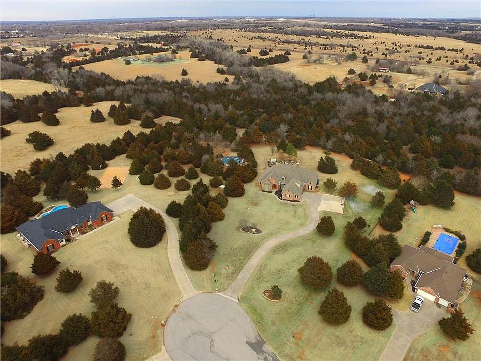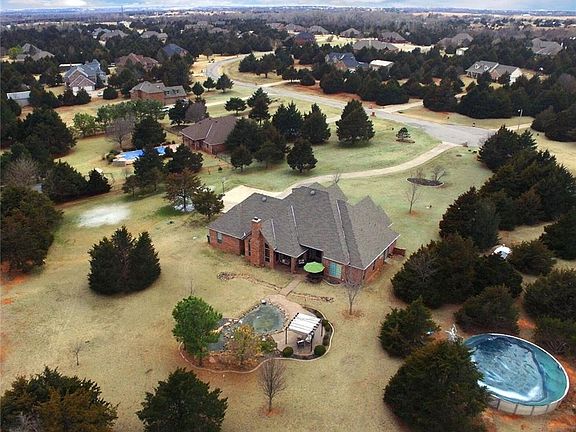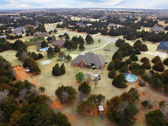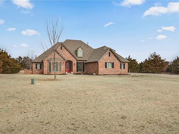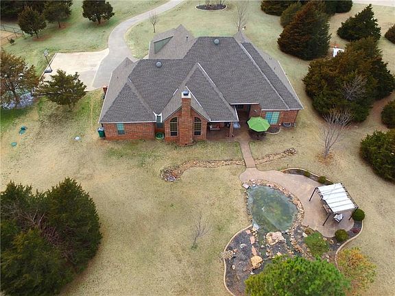 Don't miss out on this rare opportunity in Mustang schools. Gorgeous 4 bedroom 3 1/2 bath on almost 3 acres. Located at the end of a cul de sac. As you walk into your large foyer you can see the breathtaking view of the backyard features, a Koi pond with stream and second patio area with pergola. Back patio off of kitchen is beautifully tiled. Kitchen has beautiful wood cabinets with granite counters with an island. Double oven, pantry, Kitchen is open to view the living, eat in dining, & patio. Lots of storage in this home. Office, Master Bedroom is large with walk out patio doors, garden tub, shower and 2 sinks and vanity. Large Mstr. walk in closet with built-ins. Living has a gas log fireplace. Upstairs bonus room with bathroom. Laundry room has a wall locker. Two of the other 3 bedrooms share a jack/jill bath.Also:Sprinkler system,Water softener, Above ground pool, outdoor storm shelter, Large swingset/fort with Zipline. 12 X 20 shed. New geo thermal heat & air. Aerobic septic.