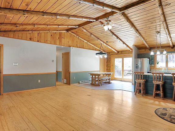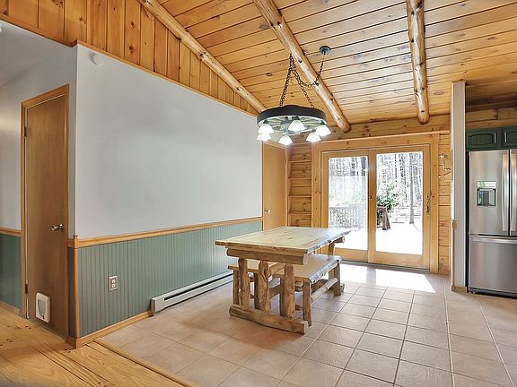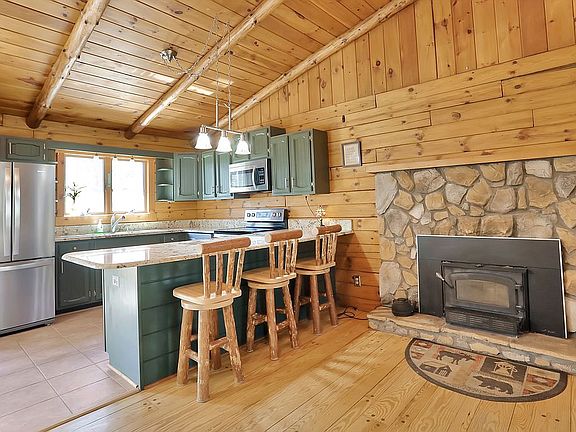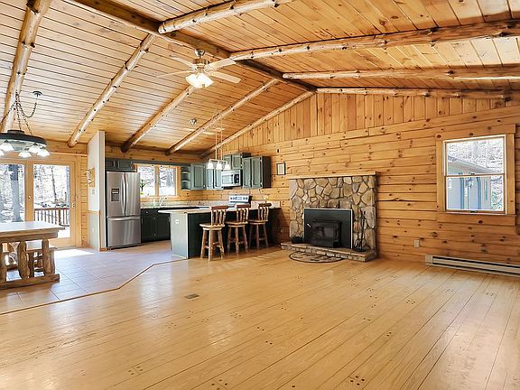 This beautifully maintained log home features an open concept living room and kitchen with a cathedral ceiling and stone surround fireplace. Gorgeous knotty pine flooring flows throughout the living room while the kitchen boasts ceramic tile flooring, new stainless steel appliances, granite countertops with an undermount sink and a breakfast bar. Enjoy the ease and convenience of having all 3 bedrooms and both full bathrooms on the main level. Additional space awaits in the partially finished lower level which includes a workshop, a bonus room to use how you see fit, and a laundry area. Another big highlight of this property is the oversized detached 2 car garage which features ample storage space and a raised floor- perfect for housing all your vehicles, tools and equipment. Secluded and private, the lot is a nature lover's paradise and you can enjoy the scenic views while relaxing on the rear deck which includes a hot tub. Even more space and possibilities await with a storage shed equipped with electric, the small barn and an 8x12 chicken coop. The rear yard is fenced and offers a separate area that is perfect for your small animals- goats, chickens, etc. Recent updates to the home include a new roof and 50 gallon water heater, the logs were also treated and re-stained last year. Eager to welcome its new owner this amazing property won't stick around long!