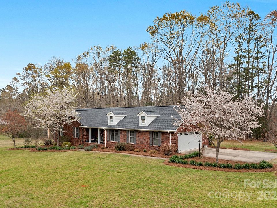 Charming brick ranch home on a stunning 4+ acre lot! Buyers will love this sunlit & spacious 3 bed 2 bath home tucked away in a private wooded retreat complete with blooming cherry trees! Relax on the covered front porch & take in the view! Enjoy cooking & entertaining in the updated kitchen w/vaulted ceilings. This inviting space features a dining area overlooking the lush front yard, a convenient breakfast bar, sleek granite countertops, newer cabinets & stainless steel appliances. The large open family room w/ high ceiling & a cozy stone fireplace offer easy access the back patio. Enjoying the great outdoor living space is a feature that will not disappoint. Off of the kitchen you will find an entryway leading to the back patio, a large laundry room, and the entrance to the oversized 2 car garage. The primary suite w/ walk in closet & 2 ample sized secondary bedrooms provides room for everyone! Newer roof. See for yourself why this beautiful home on a huge lot is so special!