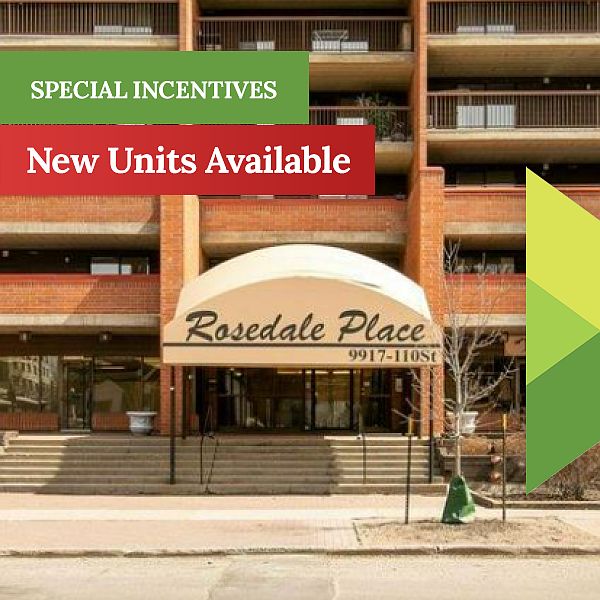 ** Rosedale Place is a newly renovated high rise concrete building, located in Oliver neighborhood with a central elevator, picnic area, and underground parking. Rosedale Place is situated just 2 blocks from Jasper Ave, 3 blocks from Grandin LRT station, and next to the River Valley where you can cycle, walk, jog, golf, and cross country ski. Rosedale Place is minutes away from Grant MacEwan University, NorQuest College, parks, churches, schools, and restaurants. Suite Features: - 4 Stainless steel appliances - Renovated kitchen - Vinyl Plank flooring - Large size balcony - Window coverings - New windows and patio door - Large size balcony - In-suite storage Building features: - High rise modern building with elevators and fob entry - Private courtyard with picnic tables, benches, and water fountain - Elevators - Secure entry - Wheelchair accessible - Smoke free building - Laundry facilities