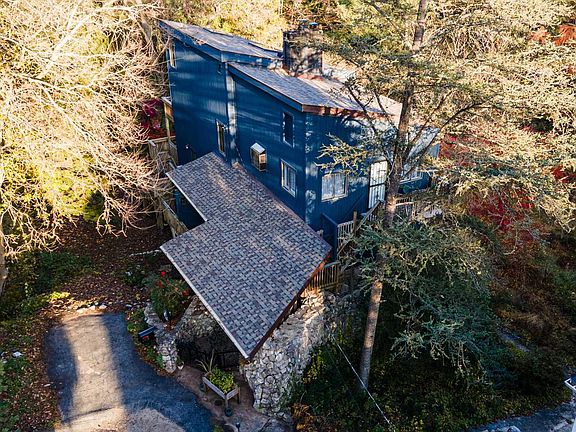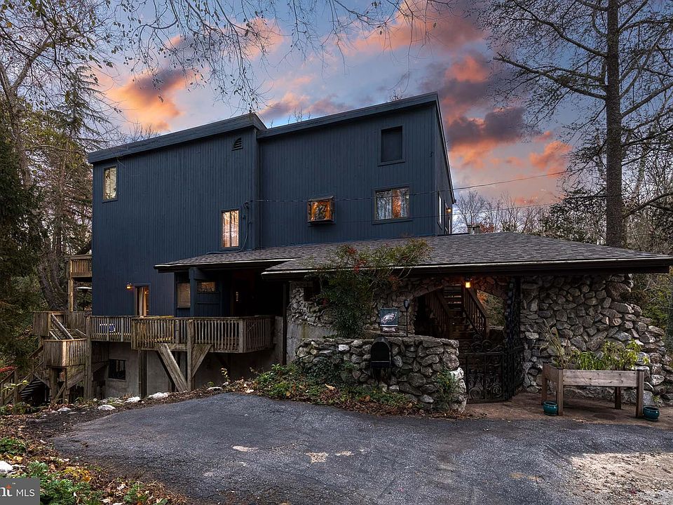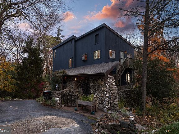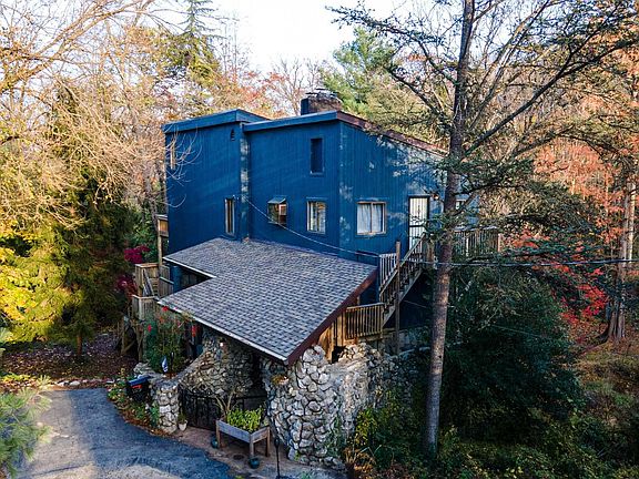 Tucked away at the end of a quiet street, this one-of-a-kind 4-bedroom, 2-bath home in Parkville feels like a private wooded retreat surrounded by a colorful tree line. The exterior features striking blue-painted cedar and stone, while the interior showcases a warm log cabin style with vaulted ceilings, skylights, recessed lighting, and hardwood floors and walls. The main level offers an open living room and kitchen with updated quartz countertops, island seating, and access to the back deck, perfect for entertaining. The primary suite includes vinyl plank flooring and an updated full bath with a beautifully tiled stall shower. Upstairs, you’ll find a gorgeous full bath with both a freestanding soaking tub & tiled stall shower, along with three spacious bedrooms, one with private deck access and another connected to the upper loft. The hallway boosts built-in bookshelves, a reader’s dream. The second upper level features a cozy open loft with wood floors and skylights, offering a peaceful spot to relax and take in the scenic tree line views. The lower level provides laundry and utility space. Enjoy the large, secluded backyard and recent updates including a new architectural shingle roof. Welcome Home!