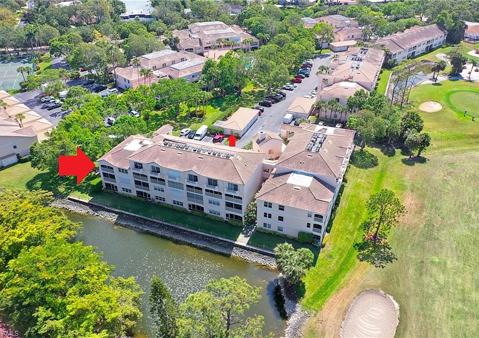 Beautiful spacious 2 bedroom 2 bath w/den located on the 3rd floor (top floor), end unit, in Fairways at Emerald Greens! This adorable unit welcomes you with both pond and golf course views! Condo has been updated with laminate thru-out living, dining and bedrooms. Light and Bright kitchen that offers sufficient cabinet space, recessed lighting and granite counter tops. Living room boasts vaulted ceilings with 2 double sliders leading out to the screened in patio, complete with electric hurricane shutters. Master bedroom comes complete with volume ceilings, an en-suite bath and walk-in closet. Guest bathroom offers a walk-in shower for convenience. This unit also comes with 2 extra storage units and a detached 1 car garage! The gorgeous community of Fairways at Emerald Greens offers luxurious amenities to include tennis/pickleball courts, pool and clubhouse close by. You are a few miles from Naples Gulf Coast Beaches and surrounded by shopping, dining, and entertainment. Golf memberships at Quail Run Golf Club are available but not mandatory for residents. Come live the Florida Golf Club lifestyle at Fairways at Emerald Greens! Furniture conveys with sale. Art décor does not convey