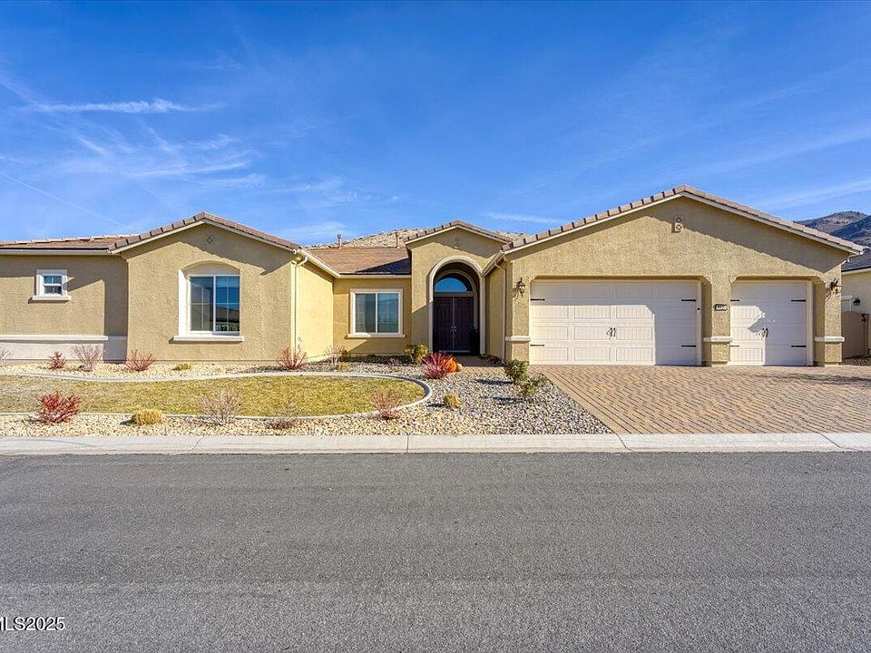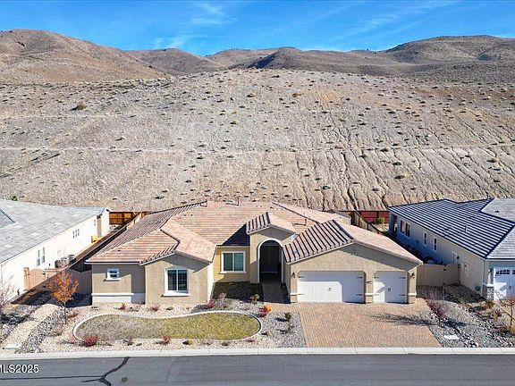Welcome to the well-situated neighborhood in Saddle Ridge, a distinctive gated community in Reno's Damonte Ranch area in South Reno. With easy access to hiking, biking, and the slopes of Mt. Rose, this home offers a balanced lifestyle just minutes from shopping, dining, and recreation. This expansive 3,189 sq ft single-story home offers four bedrooms and three bathrooms in a thoughtful floor plan. The open-concept layout is centered around a spacious great room that flows into the dining area and kitchen. A stacking sliding glass door creates a fluid indoor-outdoor connection, inviting natural light and fresh air. The private primary suite features generous proportions and spacious en-suite bath, while additional bedrooms are designed for versatility. The backyard presents a blank canvas for outdoor enjoyment with a generous covered patio. Upgrades include wiring for an EV charger, adding convenience for energy-conscious living, and epoxy flooring in the garage. As part of Saddle Ridge, residents enjoy amenities including a pool, fitness center, clubhouse, pickleball and tennis courts, and beautifully maintained walking trails.