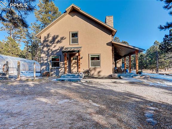 Serene retreat on 8 acres. If your idea of home involves wildlife sightings, seclusion among the pines, and oversized living spaces, you’ve found the one. This 2019 3-bedroom, 2.5-bathroom custom home is situated in the peace and quiet of 8 acres of natural privacy, surrounded by thriving ponderosa pines. Open-concept living areas leave the home feeling bright, with a kitchen that joins with the dining and family room (complete with a gas fireplace) for seamless hosting. The kitchen’s Samsung appliances and gas range allow for stress-free cooking. Find ease in your everyday routine with main-level living: the primary suite is located on the main floor with an ensuite bathroom flaunting modern fixtures. The exterior features of this home equip you for any outdoor hobby or homesteading goal you could dream of! Your outdoor oasis includes a play area, a shooting range, and an enclosure ideal for hobby farming. A fully-enclosed greenhouse turns your slice of Colorado into a year-round gardener’s paradise. The fenced chicken run with built-in roosts, electricity, and an automated coop door allows you to enjoy fresh eggs anytime. The large dog run provides a safe play space for your four-legged family members. Complete your projects in the 120 square-foot shed, complete with electricity. You’ll avoid citywide power and water disruptions since this home draws from a high-yield private well with a backup manual pump. The property’s well-maintained 2250 gallon septic system is sized for an 8 bedroom home and has already been pumped and certified by the county. Your A/C, heating, cooking, and hot water needs are powered by natural gas service to keep costs low. Plus, this property comes complete with an RV electrical hookup with up to 50 amps. We don’t see properties like this often — come see this slice of Colorado paradise today!