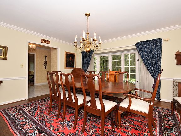 Classic center entrance Colonial, with circular driveway, nestled on an almost three-acre, private lot, with in-ground pool! First-floor bedroom and bath with four spacious bedrooms upstairs. Well maintained exterior, with mature landscaping, and lots of patio space around the pool for entertaining. Two large free-standing garages for extra storage. Make this your dream home!