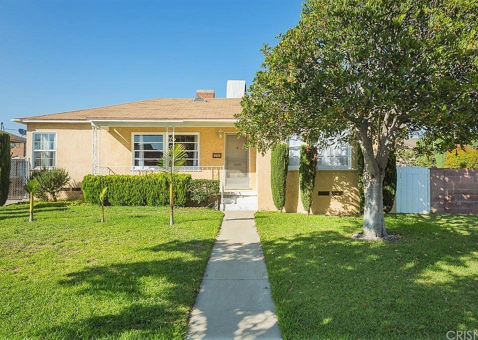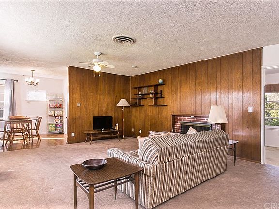 The spacious living room is bathed in natural light from a multitude of windows and is further accented by a lighted ceiling fan, cozy fireplace and plush carpet. The cook in the family is going to truly appreciate the galley kitchens large picture window, white cabinets that reach the ceiling, tiled counter-tops with full back-splash, dual basin sink, gas range, handy breakfast nook and easy care flooring. The dining room with its drop down chandelier and modern wood flooring fittingly adjoins the kitchen, making it easy to serve and entertain your guests simultaneously. The master bedroom is drenched in natural light from its bow windows and offers ample closet space and wall-to-wall carpeting. Bathroom with tiled vanity, dressing mirror, tiled tub/shower, privacy window and easy care flooring. Convenient indoor laundry room with utility sink and additional storage. Back bedroom is perfect as a family room/den or private office. Indoor laundry room with utility sink, additional storage and back yard access. The spectacular private backyard will be a favorite entertainment destination with its large open patio, expansive green lawn, colorful raised brick flowerbeds, abundant orange, peach, lime and avocado fruit trees. The detached 2 car garage and expansive driveway with gated/canopy covered parking provides plenty of room to park all your vehicles and small RVs off street. Conveniently located close to shopping, restaurants and public transportation.