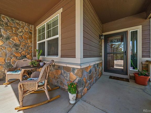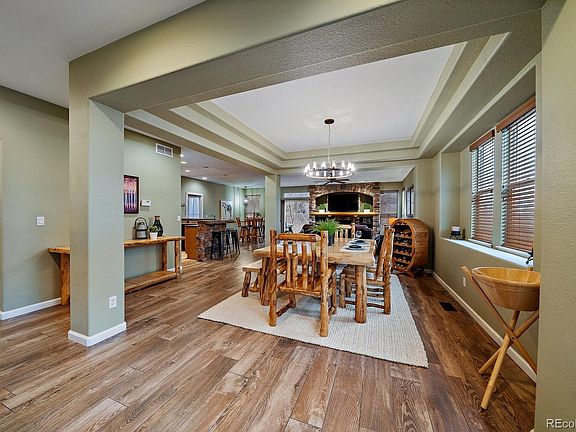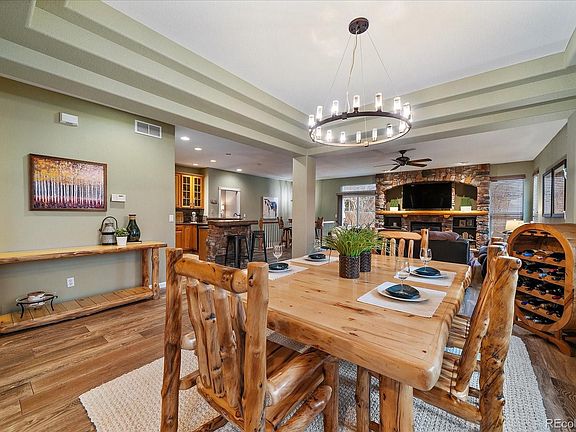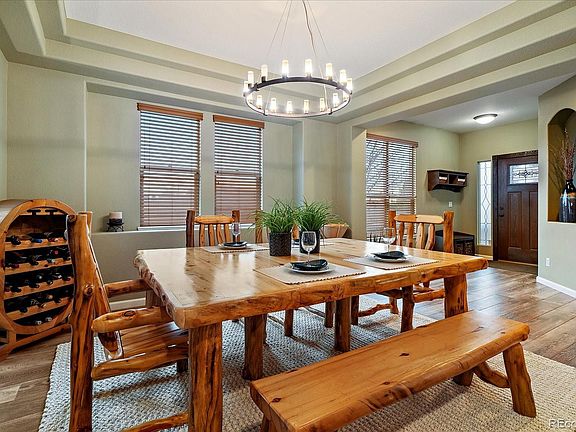 Quintessential Colorado ranch style home that offers a main level primary suite & a lovely garden retreat. Inviting & functional floor plan built for comfort & entertaining. The perfect blend of rustic wood finishes combined with modern fixtures & updated floors compliment one another to create an inviting home. Discover solid wood logs, custom woodwork, & stone-covered fireplaces throughout. This rare floor plan has an open concept kitchen with a double oven & crafted concrete slab counters and eat up bar. The kitchen flows seamlessly into the formal dining room & massive great room, complete with a stone gas burning fireplace, creating a warm & welcoming atmosphere. The main floor also boasts the primary bedroom suite with a 5-piece bathroom, large walk-in closet, 2nd full bathroom, 2nd & 3rd bedroom (or home office) & laundry room. Situated on a corner lot, this Fronterra Village home brings in lots of natural light from the unobstructed South. Seller has spared no expense creating an oasis of patio & garden living. Enjoy the sun or escape to the shade created by vine arches & varying fruit trees. The 3 tiered deck & patio with built in seating create numerous spaces for lounging, dining or just enjoying the lush & meticulously maintained garden. Backyard foliage fills in fully in the spring & summer, creating total privacy to be enjoyed. The fully finished basement features cozy, rich wood touches. Entertainers' dream basement has a rustic wet bar with beer tap & fridge, family room, pool & game areas or theater space. A 4th bedroom is perfect for guests & the spacious home gym with a yoga room & flex space could be a 5th bedroom. This charming home is the true definition of Colorado Living! Enjoy low HOA fees, quick access to highways, neighborhood parks & easy access to: Second Creek Elementary, playgrounds, trails, Bison Ridge and Eagle Ridge recreation centers, Paradise Island water park, shopping and Denver International Airport for frequent travelers.