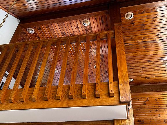 Wood burning stoveCottage style propertyDetached single car garageHeavily wooded sceneryAntique stoveSurrounded by wildlifeKnotty pine ceilings