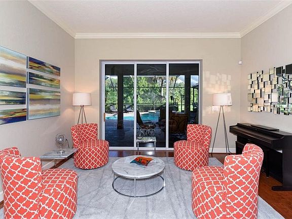 The home you've been waiting for! This expanded Hemingway open floorplan offers generous space all on one level that frames amazing outdoor living. Welcoming stylish interior with numerous upgrades including plantation shutters, crown molding, California Closets, easy-care wood laminate flooring and diagonally laid tile. The oversized owner's retreat has a sitting area overlooking the pool, double walk-in closets, bath with dual sinks, garden tub & separate shower. Additional rooms include; office, living, dining & family rooms, split plan bedrooms with 4th bed/ bath & separate bonus room perfect for multi-generational living. The kitchen is the heart of the home and is sure to be the center of your entertaining with wood cabinets, Quartz counters, center island, stainless appliances, wine cooler, walk-in pantry, work desk, & breakfast nook with aquarium window. Multiple sliders open to the screen enclosed pool area with pavered pool deck, ample covered space, heated pool & spa. Grill in your outdoor kitchen and enjoy the peaceful pond and golf views while dining al fresco. Waterlefe Golf & River Club is guard gated & offers the ultimate Florida lifestyle should you venture from your private oasis; amazing riverfront clubhouse with dining, Olympic-sized saline pool, tiki bar, and 24hr state-of-the-art fitness center. Optional golf memberships available for the highly regarded 18-hole course and boat docks are available for lease. This one will check all the boxes!