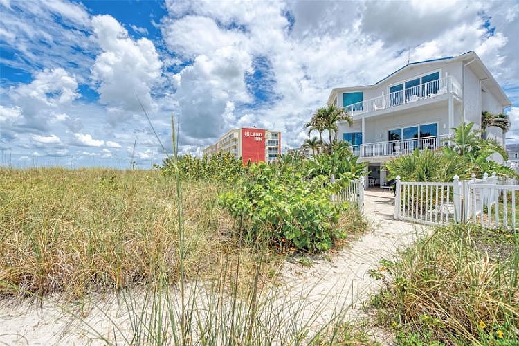 Rare opportunity to own Gulf Front property on the sand in highly coveted Treasure Island in one of the few areas that allow weekly rentals. Spectacular opportunity for either your primary or investment property with approximately 40k in monthly income! Property includes 4204 living sq ft directly on the Gulf of Mexico's sandy beaches, plus an additional 2000 sq ft of entertainment living space of outside balconies and covered area. This home is designed for entertaining with captivating views, a spacious great room, and all rooms have views of the beach. Natural sand dunes and vegetation, in addition to the depth of the beach, provide privacy in outdoor spaces. Generous sized rooms with stunning views of the Gulf of Mexico sunsets, high ceilings and natural light from large windows throughout and sliding glass doors to the balcony, provide a comfortable and beautiful environment for gatherings. This multi level home can easily accommodate your family and guests to comfortably enjoy all the house amenities, its custom carpentry, large bedrooms with en suite bathrooms, open floorplan, large kitchen seating area, and spacious family living areas facing beautiful Gulf views!