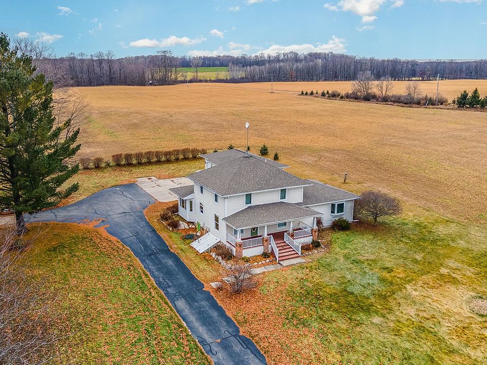 Welcome to your new home! This spacious 4-bedroom, 2.5-bathroom home spans 2,240 sq ft and sits on an expansive 10-acre lot. The residence features a main-level primary suite with a luxurious jet tub/shower, a kitchen fit for an entertainers dream, formal dining, FIRST FLOOR LAUNDRY, half bathroom & a pass through den. While the upper level showcases three additional bedrooms, each with its own closet, a full bath & walk-in hall way closet! Cherry wood cabinets and floors grace the main level, exuding warmth and elegance, complemented by original hardwood floors upstairs. Natural gas runs to the house, ensuring both convenience and efficiency. Outside, you'll find a fully insulated and finished 3-car garage, a 24' x 40' post frame building, and a 26' x 40' gamble barn showcasing original barn wood siding and a steel roof. The possibilities are endless with a part unfinished basement offering potential for customization. Embrace the charm of rural living without sacrificing modern comforts—schedule a viewing to experience the beauty and versatility of this unique property!
