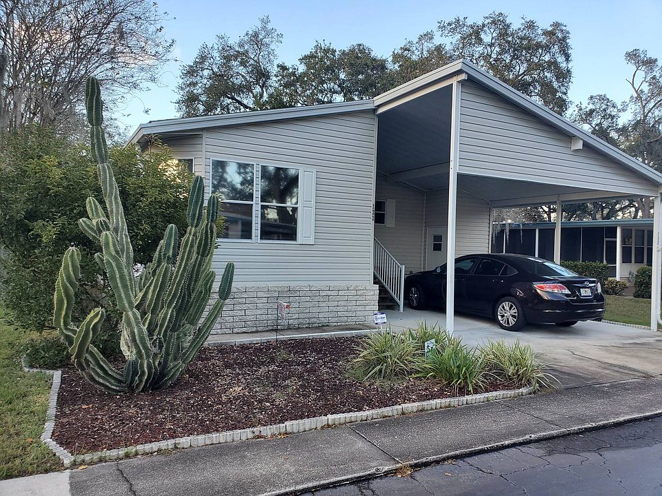 Welcome to this adorable doublewide in a wonderful 55 and older community. 2nd applicant can be 18 and older. This home sits on a dead end street with a large backyard area. Covered carport will easily hold 2 cars. Living area is very open and spacious. Kitchen area has beautiful ceramic tile flooring. Also has updated appliances, large pantry area. Plenty of cabinets and counterspace. Dining area has nice table that stays with home. There is a large Florida room that can easily be a 3rd bedroom or office. Guest room is currently used as an office but can hold a queen bed. Guest bathroom has a new vanity, updated flooring and a tub, shower combo. Master bedroom is huge!! Currently holds a king bed and still has plenty of space! His and her closets! Bed will stay. Ensuite bathroom has a nice tiled walk in shower and new vanity. This park is gated, has beautiful pool, jacuzzi, clubhouse, shuffleboard courts, fitness center. Lot fee is $760 per month. Home is available to show but not available til June 30th. CONTACT GAIL TODAY