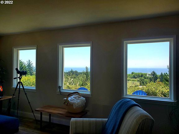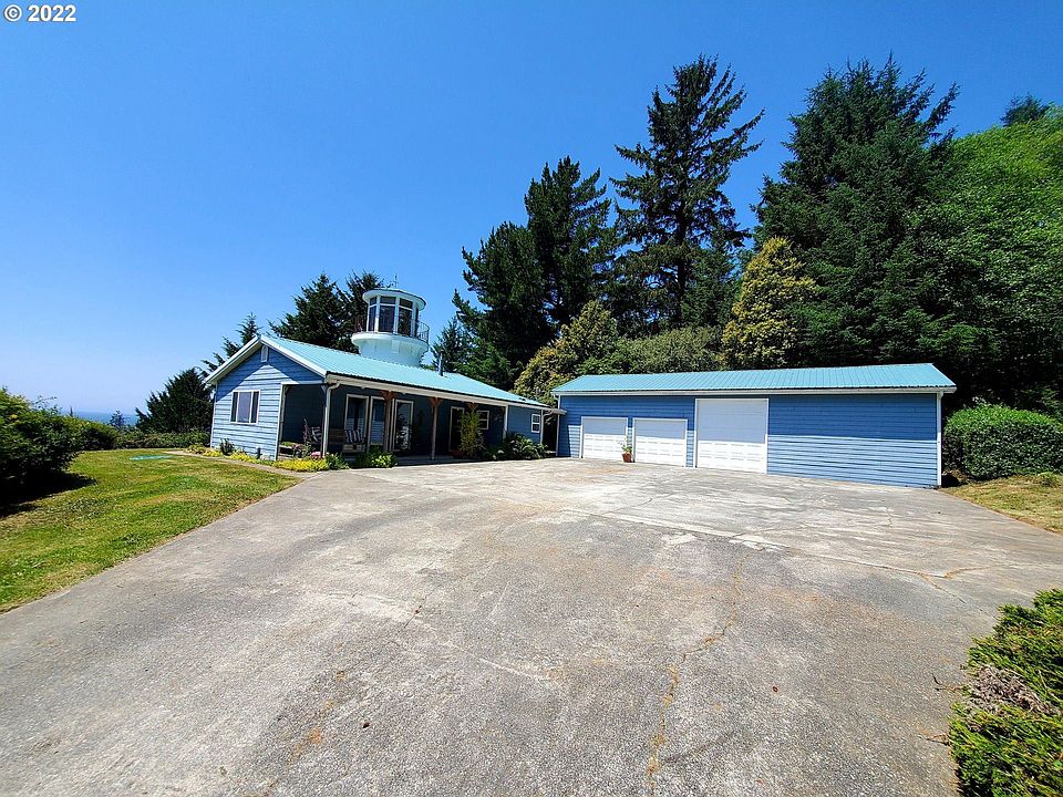 Ocean views abound with this stunning, unique lighthouse home! Beautifully remodeled with gorgeous, continuous flooring throughout. Top of the line pellet stove. Property is completely fenced and even has its own orchard with 12 apple trees. Fantastic shop\garage with 3 bays and additional work and storage space. Plenty of parking, super private and close to Brookings. Home sits above the Winchuck river with beach access at Chrissy Field State Recreation Site. Did I say ocean Views?!!!!