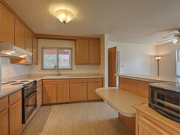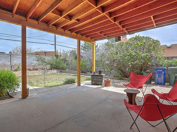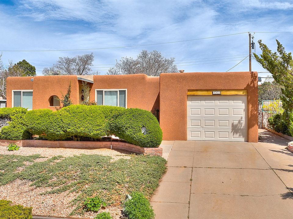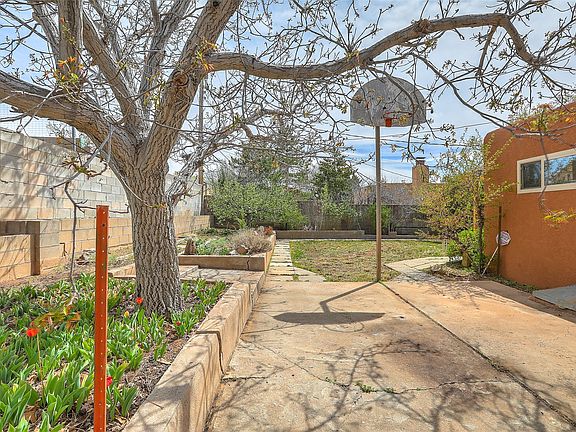 Model home built by Stamm on a cul-de-sac. Home maintained by original owners and in an established neighborhood. Walled backyard with trees inclusive of walnut, pear, apple, apricot, and plum. Landscaped area dotted with tulips. The larger backyard covered porch has a concrete base bordered by lilac and honeysuckle bushes. The side and front yard focus on hedges and some native plants. A couple of concrete steps to the original front door with wrought iron screen door and enter the living room with wood floors and floor-level kiva fireplace. Newer windows throughout the home. The kitchen boasts of a large farmhouse sink, refinished cabinetry with some pullout drawers. Bar top with extra counter separates kitchen from dining areas. Both living and dining windows face west. The laundry room with back door and wrought iron screen door lead to exterior garage door entrance and beckoning patio area. The home is cooled with refrigerated air and GFA heating for the wintertime. Wood flooring in 3 bedrooms, hallway, and living and dining areas. Full bath in hallway. Shower in primary bedroom. Only a handful of homes in this cul-de-sac neighborhood.